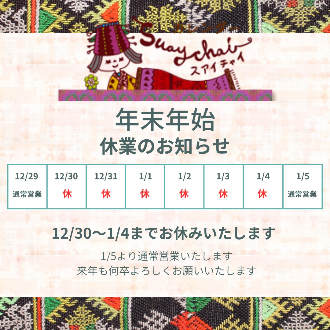 年末年始の営業日のお知らせです。実店舗は12/29(月)まで通常営業です。