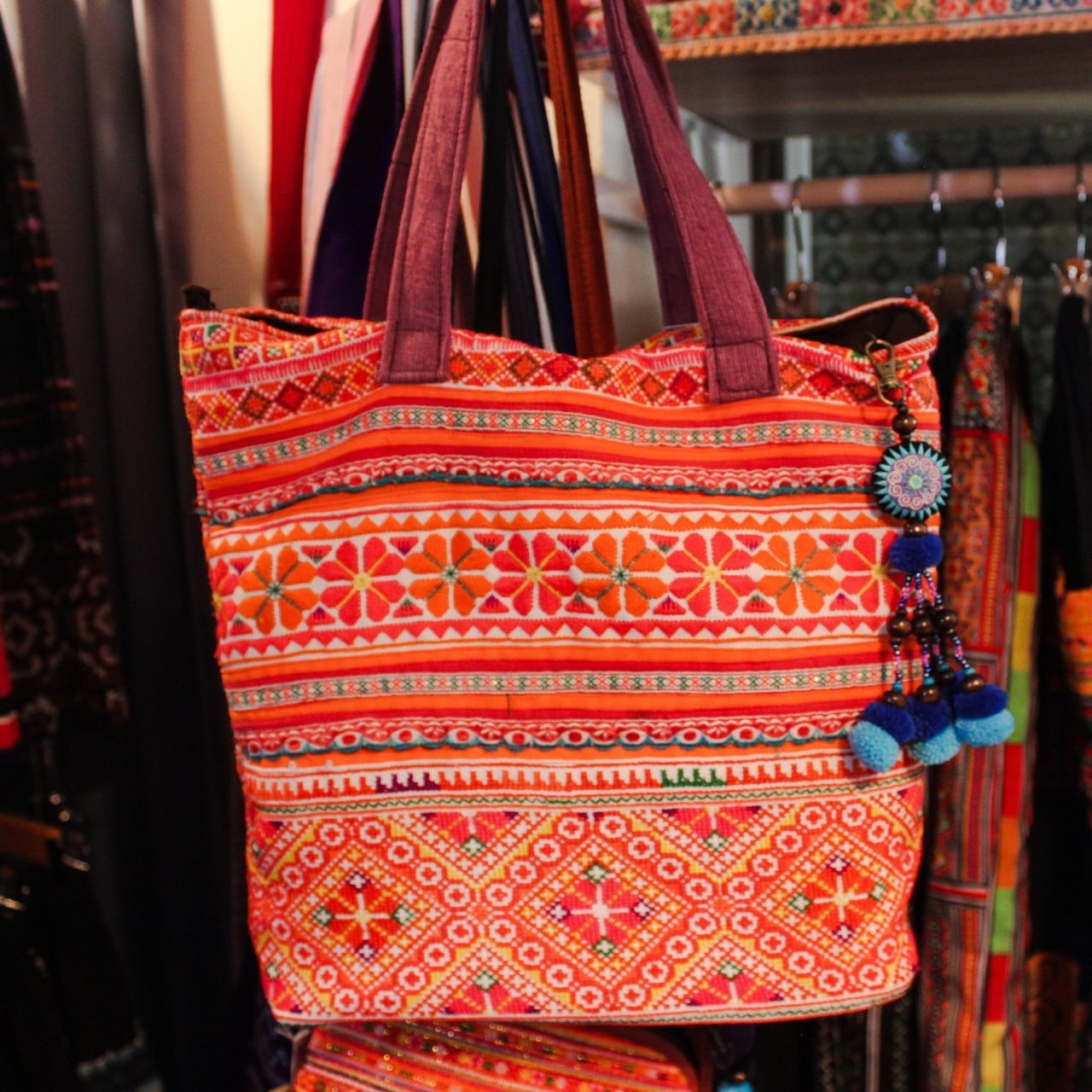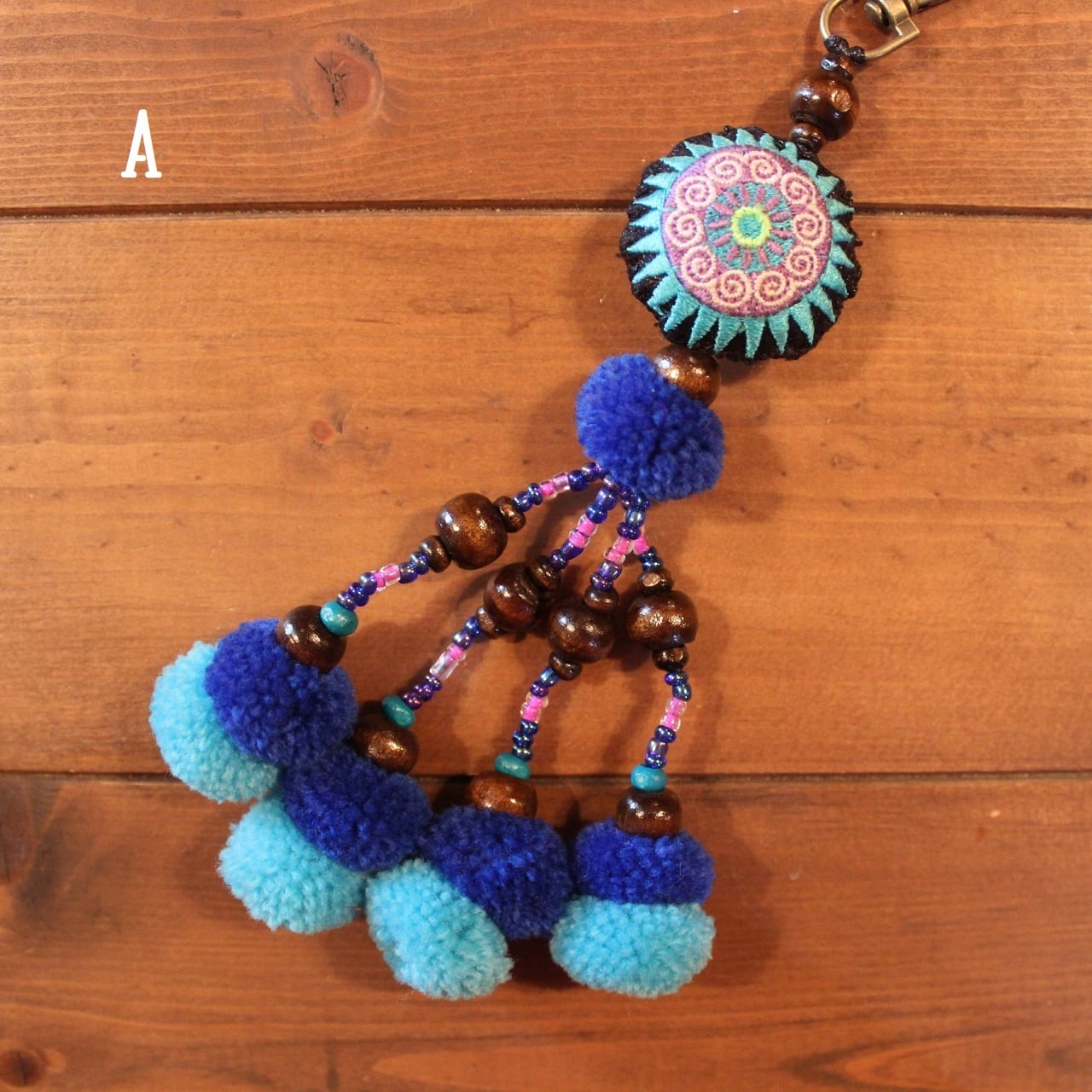 モン族刺繍ワッペンとポンポン、ビーズのカラフルで可愛いチャームです。