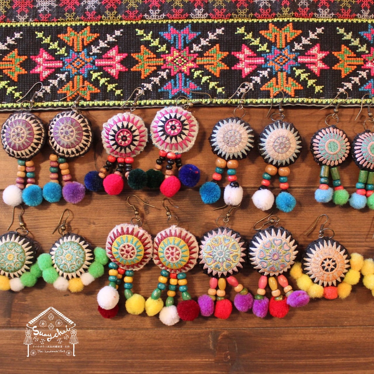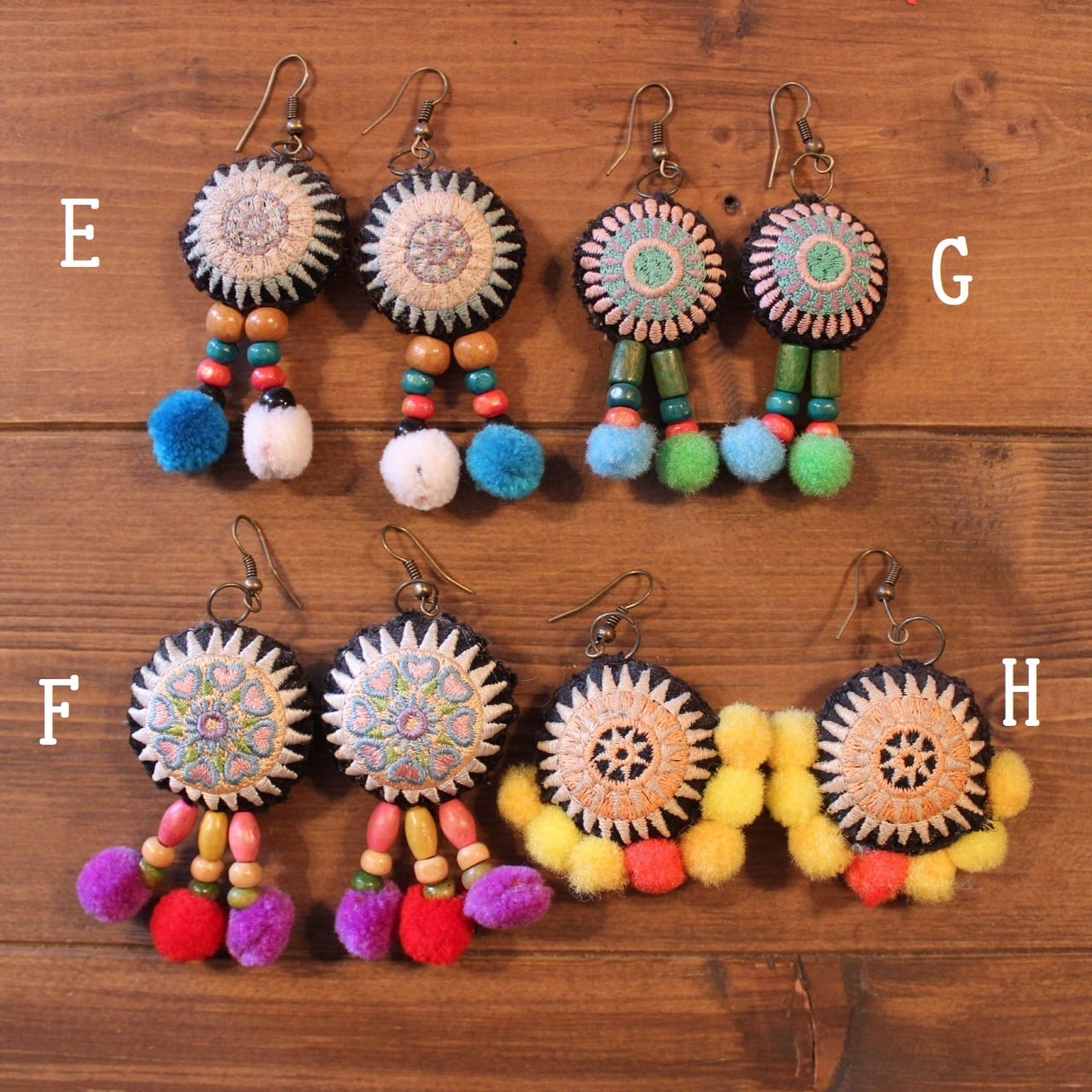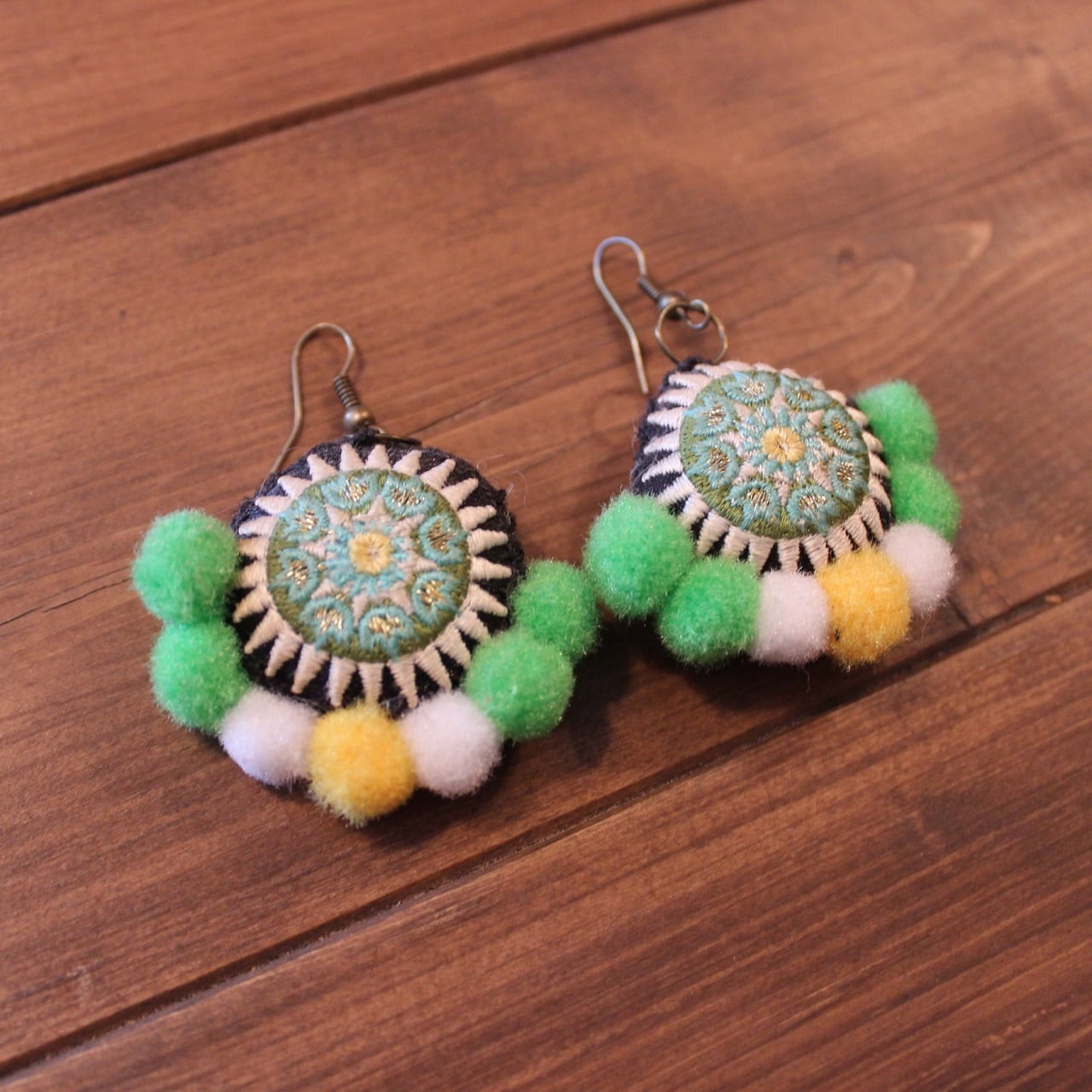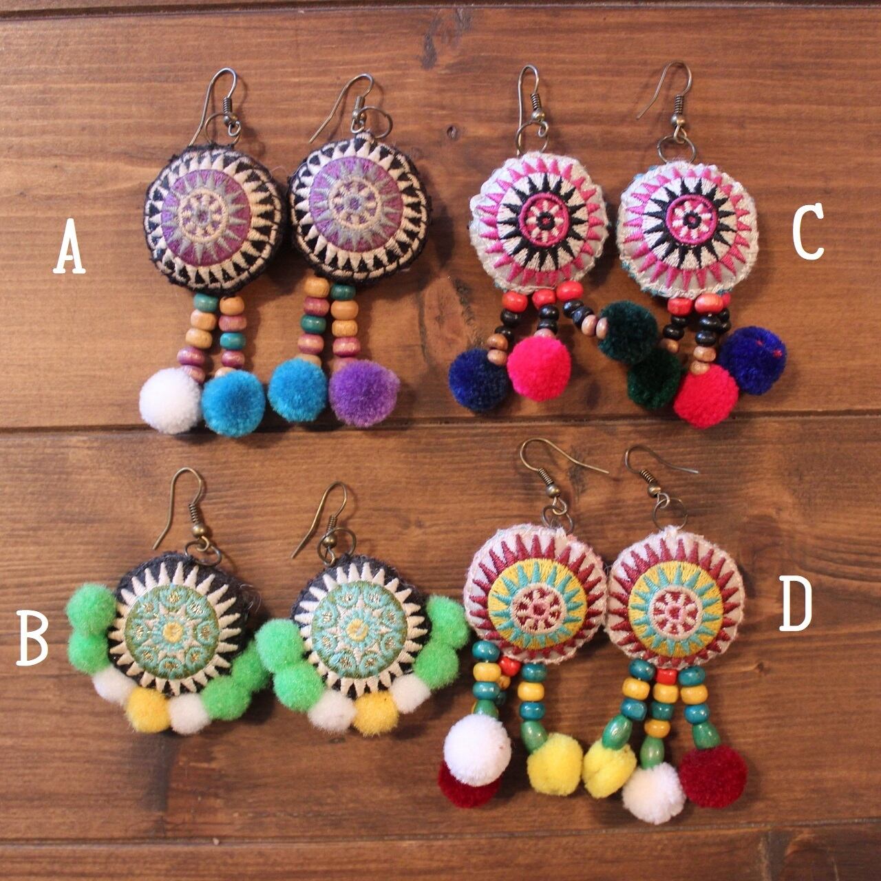 モン族刺繍ワッペンとポンポン、ウッドビーズの可愛いピアスです。